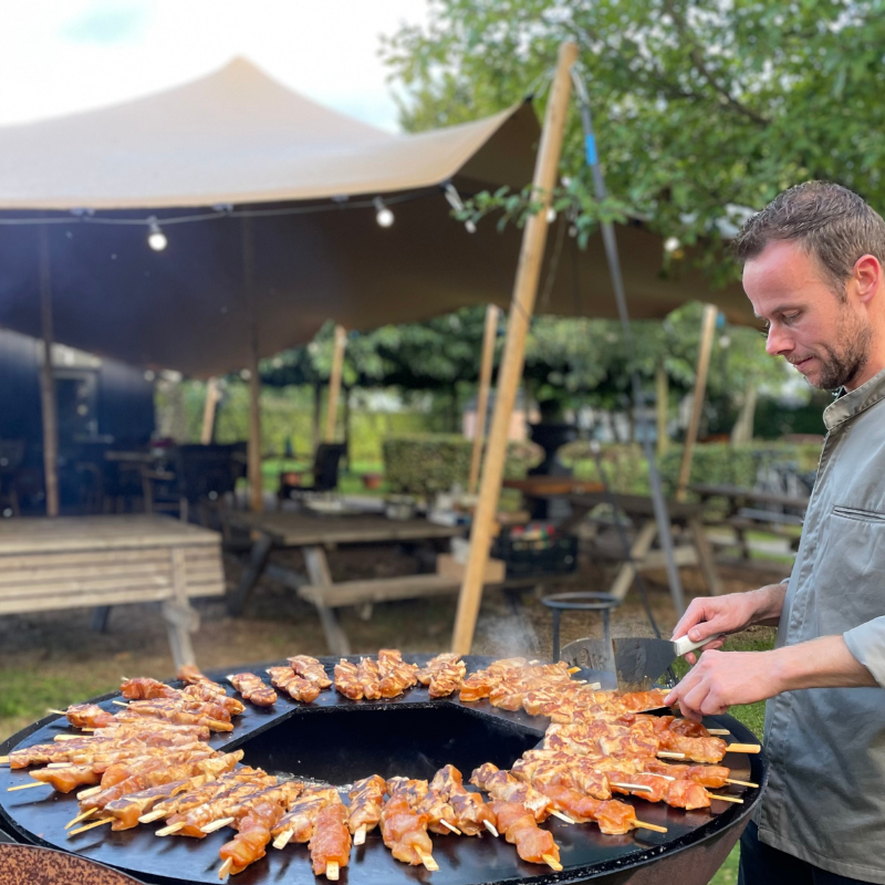 Für noch mehr kulinarische Kochmöglichkeiten bieten die Etageren den Dot PRO oder den Dot BBQ PRO (mit Grillschlitzen), beide aus 10 mm Spezialstahl, extra Koch- und Grillfläche. Die Etagere de Dot WokGrill ist auch für die PRO-Versionen geeignet und kann zur Zubereitung des Specials verwendet werden Co-Feuer-Wok und/oder Grillspieße . Jetzt vorübergehend mit einem frei Grillspieß-Set, bestehend aus 6 Edelstahlspießen à 45 cm. Etwaige heiße Punkte können nach dem Löschen mit feuerfesten Handschuhen, den Co-Fire-Handschuhen, entfernt werden, sodass die Abdeckplatte zum Schutz auf die Feuerschale gelegt werden kann.