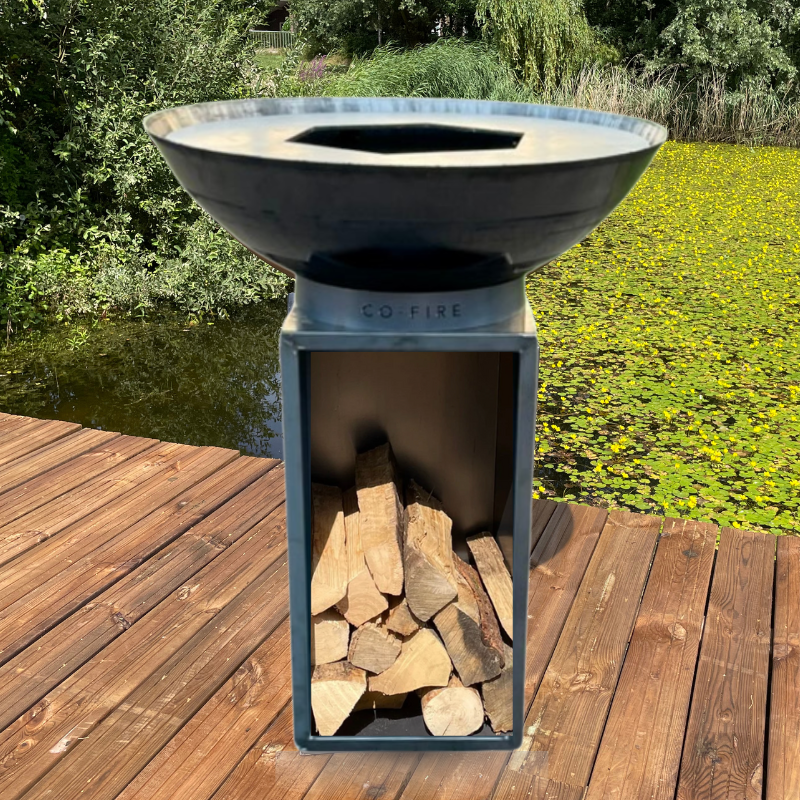 Die Feuerschale aus Cortenstahl mit einem Durchmesser von 88–90 cm besteht aus 3 mm dickem Cortenstahl. Cortenstahl ist eine witterungsbeständige Stahlsorte und eignet sich sehr gut für den täglichen Transport des Sets. Diese Skala wurde für die +-Version angepasst.
